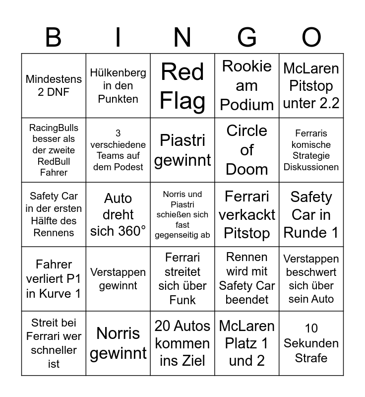 This bingo card has a free space and 24 words: Verstappen gewinnt, Norris gewinnt, Piastri gewinnt, Streit bei Ferrari wer schneller ist, McLaren Pitstop unter 2.2, Mindestens 2 DNF, RacingBulls besser als der zweite RedBull Fahrer, Hülkenberg in den Punkten, Ferrari verkackt Pitstop, Ferrari streitet sich über Funk, Circle of Doom, Safety Car in der ersten Hälfte des Rennens, Rennen wird mit Safety Car beendet, Verstappen beschwert sich über sein Auto, 3 verschiedene Teams auf dem Podest, McLaren Platz 1 und 2, Safety Car in Runde 1, Red Flag, Ferraris komische Strategie Diskussionen, Auto dreht sich 360°, 10 Sekunden Strafe, Fahrer verliert P1 in Kurve 1, Rookie am Podium and 20 Autos kommen ins Ziel.