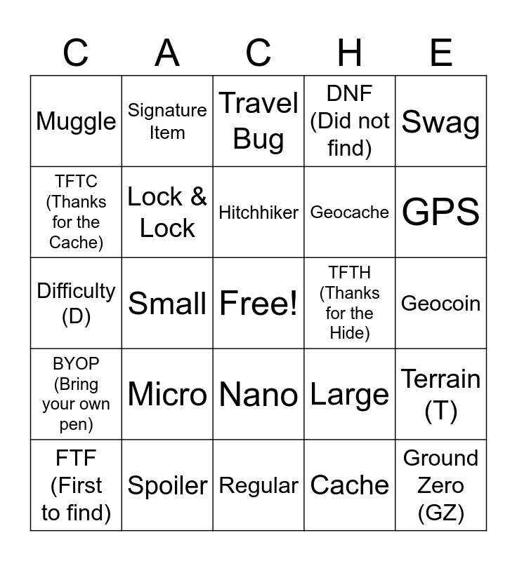 This bingo card has a free space and 24 words: Micro, Spoiler, Hitchhiker, FTF (First to find), Swag, Muggle, TFTC (Thanks for the Cache), Signature Item, TFTH (Thanks for the Hide), Nano, Geocache, Difficulty (D), Large, Terrain (T), Lock & Lock, Cache, Geocoin, Travel Bug, GPS, Small, Ground Zero (GZ), BYOP (Bring your own pen), DNF (Did not find) and Regular.