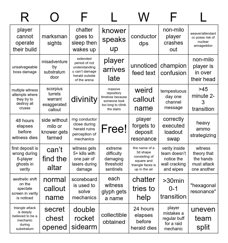 This bingo card has a free space and 49 words: >30min 0-1 transition, champion confusion, 24 hours elapses before herald dies, side without milo or knower gets farmed, divinity, heavy ammo strategizing, marksman sights, double rocket sidearm, non-milo player crashes out, extreme difficulty damaging threshold sentinels, weaver/attendant cc poses risk of nuclear armageddon, knower speaks up, tempestuous day one channel message, weird callout name, normal callout name, correctly executed loadout swap, unsalvageable boss damage, non-milo player is in over their head, "hexagonal resonance", conductor dps, unnoticed feed text, rng conductor close during herald ruins perception of mechanics, player cannot operate their build, misadventure by substratum door, triangle attack is deeply believed to be a mechanic during substratum, extended period of not understanding u can’t damage herald outside of the arena, >45 minute 2-3 transition, secret chest opened, massive repository timeloss because someone took too long to climb the stairs, scorpius turrets warrant exaggerated callout, repository threshold sentinel knocks someone off the edge in 3rd room, player forgets to deposit resonance, aesthetic shift on the spectate screen in verity is noticed, scoreboard is used to solve mechanics, 48 hours elapses before witness dies, the name of a 3d shape consisting of square and triangle faces is up in the air, verity inside team doesn’t notice the wall cracking and wipes, witness theory that the hands must attack one another, multiple witness attempts where they try to destroy all cruxes, witness gets 5+ kills with one pair of lasers during damage, each witness glyph gets a name, first deposit is wrong during 6-player ghosts in verity, uneven team split, collectible obtained, player arrives late, chatter goes to sleep then wakes up, chatter tries to help, can’t find the altar and player mistakes a regular buff for a raid mechanic.