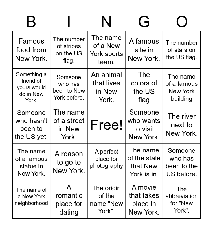 This bingo card has a free space and 25 words: The name of a New York neighborhood ., A reason to go to New York., An animal that lives in New York., A movie that takes place in New York., The name of a famous New York building, Famous food from New York., The number of stripes on the US flag., The name of a New York sports team., The colors of the US flag, Someone who has been to the US before., Someone who hasn't been to the US yet., Someone who has been to New York before., The name of the state that New York is in., The abbreviation for "New York"., Something a friend of yours would do in New York., A romantic place for dating, The origin of the name "New York"., A famous site in New York., The river next to New York., The name of a famous statue in New York., The name of a street in New York., A perfect place for photography, Someone who wants to visit New York., The number of stars on the US flag. and s.