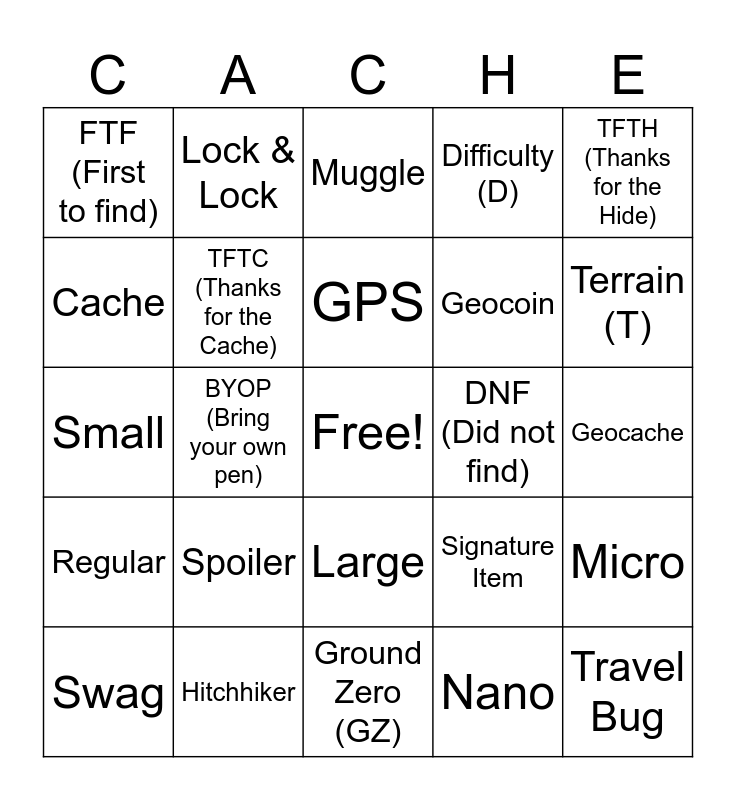 This bingo card has a free space and 24 words: Spoiler, Hitchhiker, GPS, Swag, TFTH (Thanks for the Hide), FTF (First to find), Cache, Lock & Lock, DNF (Did not find), Large, Geocoin, Small, Signature Item, Micro, TFTC (Thanks for the Cache), Nano, Geocache, Muggle, Terrain (T), BYOP (Bring your own pen), Travel Bug, Regular, Difficulty (D) and Ground Zero (GZ).