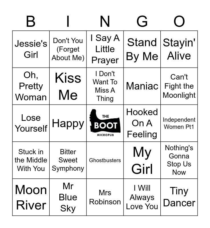 This bingo card has a free space and 50 words: (I've Had) The Time Of My Life, Tiny Dancer, Purple Rain, Mrs Robinson, Bitter Sweet Symphony, Footloose, Don't You (Forget About Me), What Was I Made For?, Oh, Pretty Woman, You Make My Dreams (Come True), Kiss Me, Stand By Me, Nothing's Gonna Stop Us Now, My Girl, Kiss from a Rose, Accidentally In Love, I Don't Want To Miss A Thing, Hooked On A Feeling, Take My Breath Away, Stayin' Alive, Happy, I Will Always Love You, Jessie's Girl, Maniac, The Power of Love, Bohemian Rhapsody, Can't Fight the Moonlight, Holding Out for a Hero, I Say A Little Prayer, Ghostbusters, Can't Take My Eyes Off You, All Star, Love Is All Around, Eye of the Tiger, Mr Blue Sky, Space Jam, Anyone Else But You, Can't Stop The Feeling!, Hip to be Square, Independent Women Pt1, Time Warp, Men In Black, Where Is My Mind?, Gangsta's Paradise, Moon River, Lose Yourself, Jai Ho! (You Are My Destiny), My Heart Will Go On, Stuck in the Middle With You and You Never Can Tell.