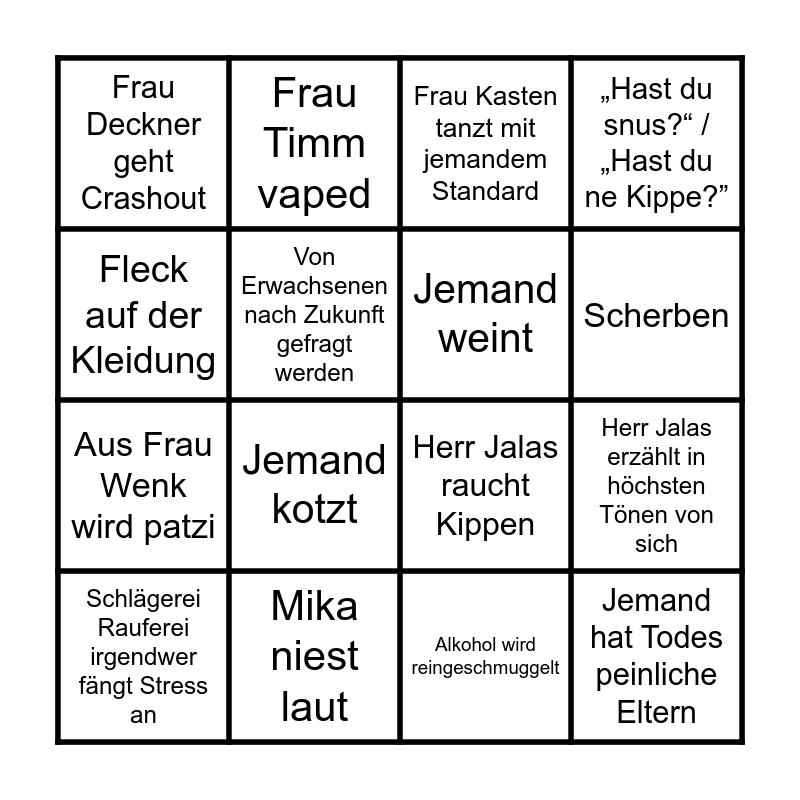 This bingo card has 16 words: Mika niest laut, Herr Jalas erzählt in höchsten Tönen von sich, Frau Kasten tanzt mit jemandem Standard, Frau Deckner geht Crashout, Aus Frau Wenk wird patzi, Frau Timm vaped, Herr Jalas raucht Kippen, Alkohol wird reingeschmuggelt, Fleck auf der Kleidung, Von Erwachsenen nach Zukunft gefragt werden, Schlägerei Rauferei irgendwer fängt Stress an, „Hast du snus?“ / „Hast du ne Kippe?”, Jemand kotzt, Scherben, Jemand weint and Jemand hat Todes peinliche Eltern.