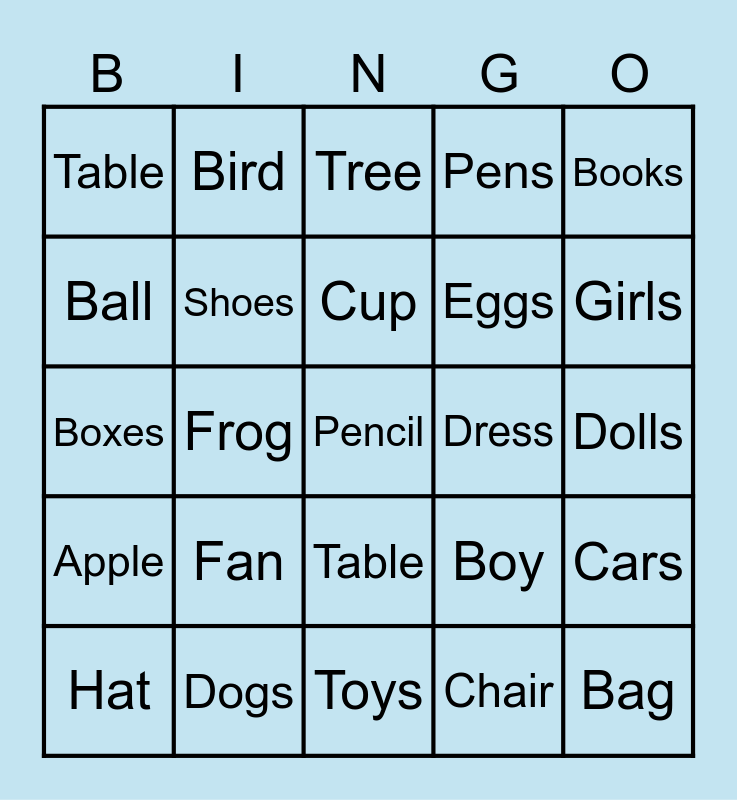 This bingo card has 25 words: Apple, Dogs, Pencil, Chair, Books, Table, Bird, Tree, Dress, Cars, Ball, Shoes, Toys, Boy, Girls, Hat, Frog, Cup, Eggs, Dolls, Boxes, Fan, Table, Pens and Bag.