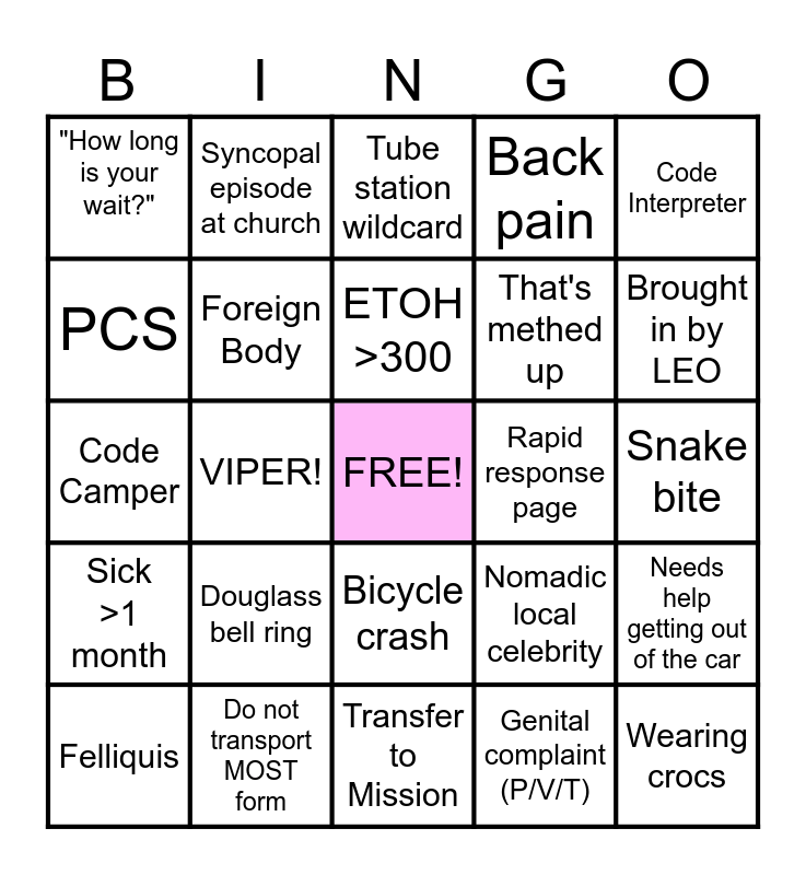 This bingo card has a free space and 24 words: Douglass bell ring, Do not transport MOST form, ETOH >300, Felliquis, Code Interpreter, "How long is your wait?", PCS, Syncopal episode at church, Rapid response page, Bicycle crash, That's methed up, Code Camper, Nomadic local celebrity, Needs help getting out of the car, Foreign Body, Genital complaint (P/V/T), Snake bite, Tube station wildcard, Brought in by LEO, VIPER!, Wearing crocs, Sick >1 month, Back pain and Transfer to Mission.