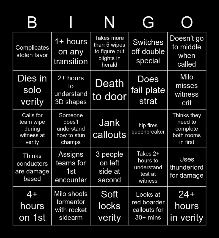 This bingo card has a free space and 24 words: Assigns teams for 1st encounter, Milo shoots tormentor with rocket sidearm, Death to door, 4+ hours on 1st, Doesn't go to middle when called, Complicates stolen favor, Dies in solo verity, 1+ hours on any transition, hip fires queenbreaker, 3 people on left side at second, Does fail plate strat, Calls for team wipe during witness at verity, Takes 2+ hours to understand test at witness, Uses thunderlord for damage, 2+ hours to understand 3D shapes, Looks at red boarder callouts for 30+ mins, Thinks they need to complete both rooms in first, Takes more than 5 wipes to figure out blights in herald, Milo misses witness crit, Someone does't understand how to stun champs, 24+ hours in verity, Thinks conductors are damage based, Switches off double special and Soft locks verity.