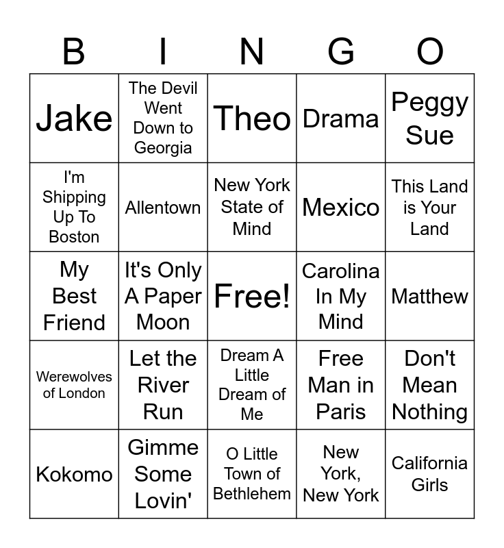 This bingo card has a free space and 69 words: Jessica, Matthew, The Times They Are A-Changin', Mr. Tambourine Man, Gimme Some Lovin', Spencer, Drama, Chicken Little, Peggy Sue, Endless Summer Nights, Don't Mean Nothing, Rebecca, Jake, Theo, Noa, It's Only A Paper Moon, Dream A Little Dream of Me, Mexico, London Calling, Werewolves of London, Carolina In My Mind, Free Man in Paris, This Land is Your Land, Philadelphia Freedom, Love Shack, Take Me Home, Country Roads, The Flowers of Guatamala, Mambo Italiano, New York, New York, Prague, The Devil Went Down to Georgia, Jessie's Girl, Born in the U.S.A., Motownphilly, Midnight Train to Georgia, Georgia on My Mind, Graceland, Budapest, I'm Shipping Up To Boston, New Madrid, Let the River Run, California Girls, Jersey Girl, Postcards from Italy, The Promise, Kokomo, Scenes From An Italian Restaurant, Amsterdam, Sweet Home Alabama, Allentown, New York State of Mind, Do You Know the Way to San Jose, Our House, O Little Town of Bethlehem, Over The Rainbow, Father and Son, Father and Daughter, You've Got A Friend in Me, True Companion, My Best Friend, It Had To Be You, Teach Your Children, Homeward Bound, Maine, Atomic Dog, Off The Ground, The Cave, Burn The House Down and Psycho Killer.