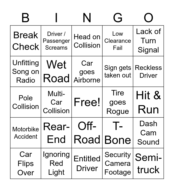 This bingo card has a free space and 24 words: Rear-End, Ignoring Red Light, Car goes Airborne, Car Flips Over, Lack of Turn Signal, Break Check, Unfitting Song on Radio, Driver / Passenger Screams, Tire goes Rogue, Off-Road, Sign gets taken out, Pole Collision, T-Bone, Dash Cam Sound, Wet Road, Security Camera Footage, Hit & Run, Head on Collision, Reckless Driver, Multi-Car Collision, Semi-truck, Motorbike Accident, Low Clearance Fail and Entitled Driver.
