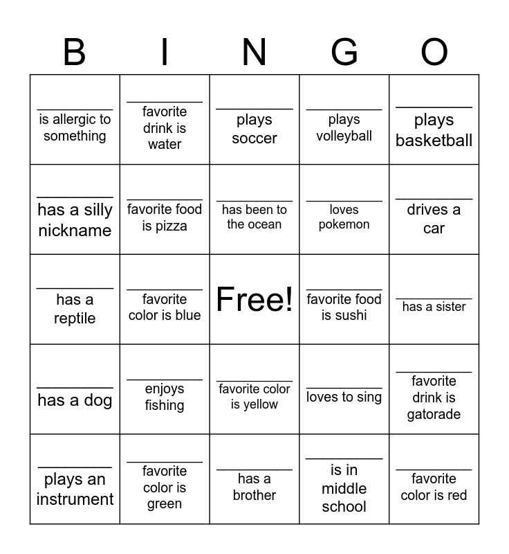 This bingo card has a free space and 29 words: ________ plays an instrument, ________ is an only child, __________ favorite color is blue, __________ Name starts with a B, __________ is allergic to something, _________ plays soccer, __________ favorite food is pizza, __________ enjoys fishing, __________ favorite food is sushi, __________ favorite color is green, ___________ has a sister, __________ favorite color is red, __________ has a brother, _________ is in middle school, _________ drives a car, _________ has a cat, ___________ favorite color is yellow, ________ has a dog, ________ plays basketball, _________ has a reptile, __________ loves to sing, _________ loves coffee, ___________ loves pokemon, ________ has a silly nickname, __________ plays volleyball, __________ favorite drink is water, __________ favorite drink is gatorade, ___________ has been to the ocean and ____________ speaks another language.