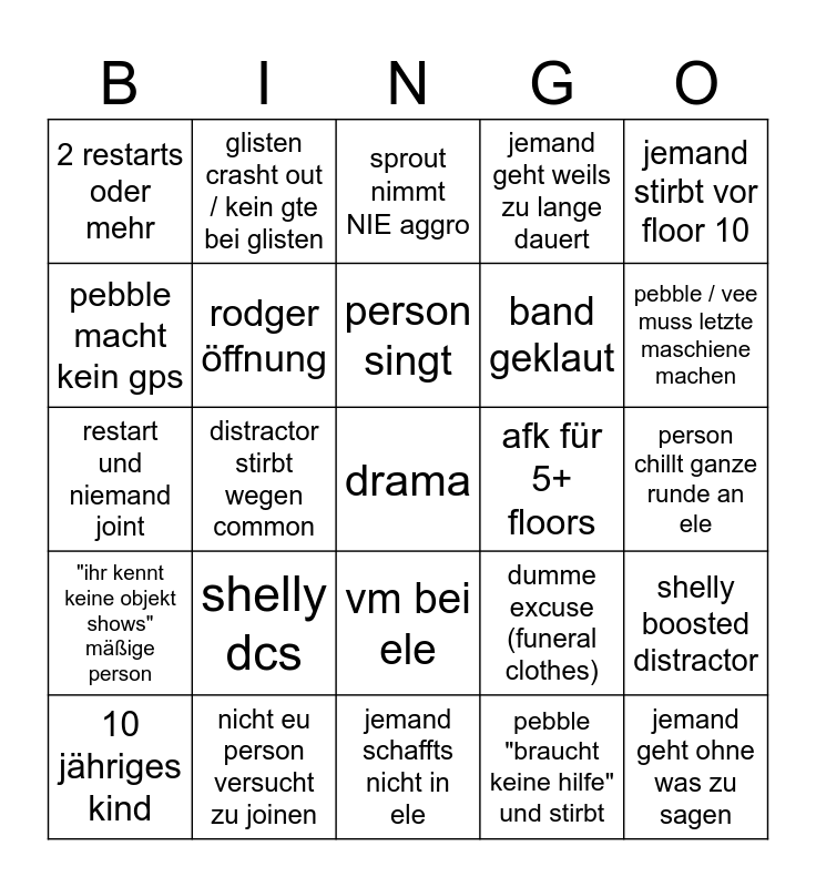 This bingo card has a free space and 24 words: shelly dcs, nicht eu person versucht zu joinen, person singt, 10 jähriges kind, jemand stirbt vor floor 10, 2 restarts oder mehr, pebble macht kein gps, glisten crasht out / kein gte bei glisten, afk für 5+ floors, vm bei ele, band geklaut, restart und niemand joint, dumme excuse (funeral clothes), shelly boosted distractor, rodger öffnung, pebble "braucht keine hilfe" und stirbt, person chillt ganze runde an ele, sprout nimmt NIE aggro, pebble / vee muss letzte maschiene machen, distractor stirbt wegen common, jemand geht ohne was zu sagen, "ihr kennt keine objekt shows" mäßige person, jemand geht weils zu lange dauert and jemand schaffts nicht in ele.