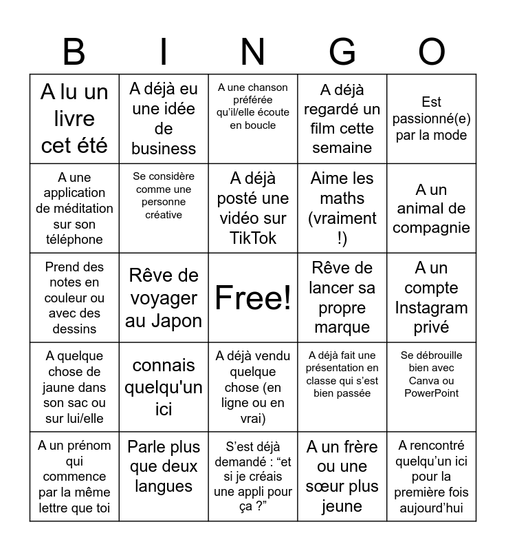 This bingo card has a free space and 24 words: connais quelqu'un ici, Parle plus que deux langues, A déjà posté une vidéo sur TikTok, A un prénom qui commence par la même lettre que toi, Est passionné(e) par la mode, A lu un livre cet été, A une application de méditation sur son téléphone, A déjà eu une idée de business, Rêve de lancer sa propre marque, A déjà vendu quelque chose (en ligne ou en vrai), Aime les maths (vraiment !), Prend des notes en couleur ou avec des dessins, A déjà fait une présentation en classe qui s’est bien passée, Se débrouille bien avec Canva ou PowerPoint, Se considère comme une personne créative, A un frère ou une sœur plus jeune, A un compte Instagram privé, A une chanson préférée qu’il/elle écoute en boucle, A un animal de compagnie, Rêve de voyager au Japon, A rencontré quelqu’un ici pour la première fois aujourd’hui, A quelque chose de jaune dans son sac ou sur lui/elle, A déjà regardé un film cette semaine and S’est déjà demandé : “et si je créais une appli pour ça ?”.