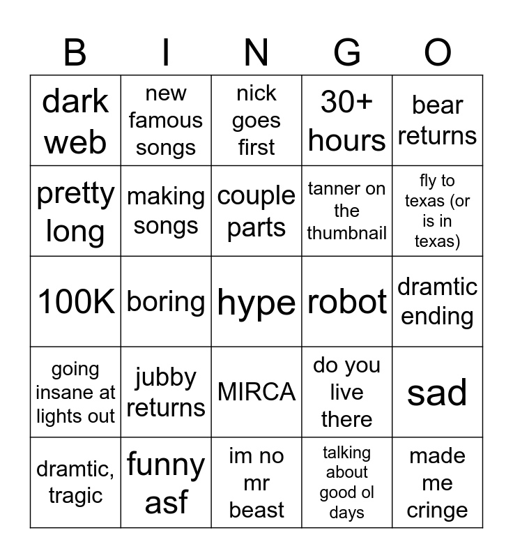 This bingo card has a free space and 24 words: jubby returns, funny asf, couple parts, dramtic, tragic, bear returns, dark web, pretty long, new famous songs, robot, MIRCA, tanner on the thumbnail, 100K, do you live there, sad, making songs, talking about good ol days, dramtic ending, nick goes first, fly to texas (or is in texas), boring, made me cringe, going insane at lights out, 30+ hours and im no mr beast.