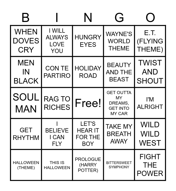 This bingo card has a free space and 42 words: AQUARIUS/LET THE SUNSHINE IN, HOLIDAY ROAD, LOSE YOURSELF, I BELIEVE I CAN FLY, BITTERSWEET SYMPHONY, WILD WILD WEST, FIGHT THE POWER, IF YOU LEAVE, HUNGRY EYES, LET'S HEAR IT FOR THE BOY, I'M ALRIGHT, TWIST AND SHOUT, RAG TO RICHES, E.T. (FLYING THEME), SUPERMAN (MAIN TITLE), TAKE MY BREATH AWAY, YOU'VE GOT A FRIEND IN ME, SOUL MAN, IT HAD TO BE YOU, I WILL ALWAYS LOVE YOU, MEN IN BLACK, THE BARE NECESSITIES, MORE THAN A WOMAN, WHEN DOVES CRY, STUCK IN THE MIDDLE WITH YOU, MISIRLOU, BEAUTY AND THE BEAST, BOOM SHAK A LAK, HEARTS ON FIRE, MY FAVORITE THINGS, DON'T YOU (FORGET ABOUT ME), GET RHYTHM, CON TE PARTIRO, PROLOGUE (HARRY POTTER), YOU'RE THE BEST, HALLOWEEN (THEME), THIS IS HALLOWEEN, GET OUTTA MY DREAMS, GET INTO MY CAR, COME FLY WITH ME, I'M SHIPPING OFF TO BOSTON, WAYNE'S WORLD THEME and SUPERCALI FRAGILISTIC EXPIAL ODOCIOUS.