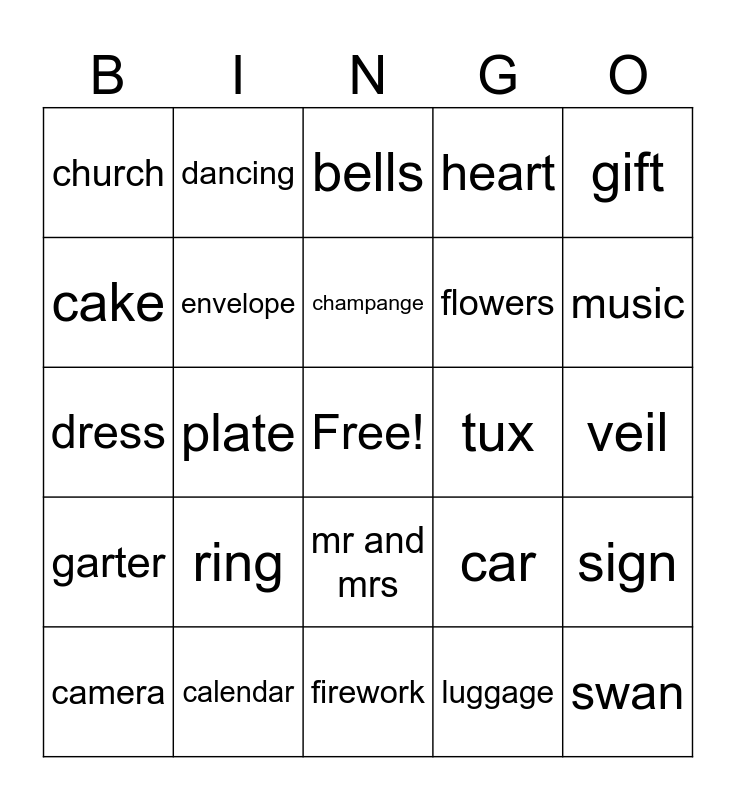 This bingo card has a free space and 24 words: ring, calendar, champange, camera, gift, church, cake, dancing, tux, mr and mrs, flowers, dress, car, sign, envelope, luggage, veil, bells, music, plate, swan, garter, heart and firework.