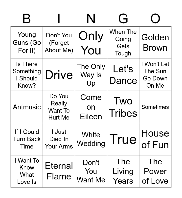 This bingo card has 41 words: Free!, Antmusic, The Sun Always Shines On TV, Drive, Eternal Flame, White Wedding, The Only Way Is Up, Call Me, Golden Brown, If I Could Turn Back Time, Do You Really Want To Hurt Me, When The Going Gets Tough, Come on Eileen, Sometimes, Two Tribes, I Just Died In Your Arms, Invisible Touch, Young Guns (Go For It), China In Your Hand, Only You, House of Fun, The Power of Love, Don't You Want Me, Let's Dance, Too Shy, All Night Long (All Night), The Living Years, Karma Chameleon, I Won't Let The Sun Go Down On Me, Enola Gay, Easy Lover, Don't You (Forget About Me), I Want To Know What Love Is, Temptation, True, Is There Something I Should Know?, Relax, Tainted Love, What's Love Got To Do With It, Red Red Wine and Wonderful Life.