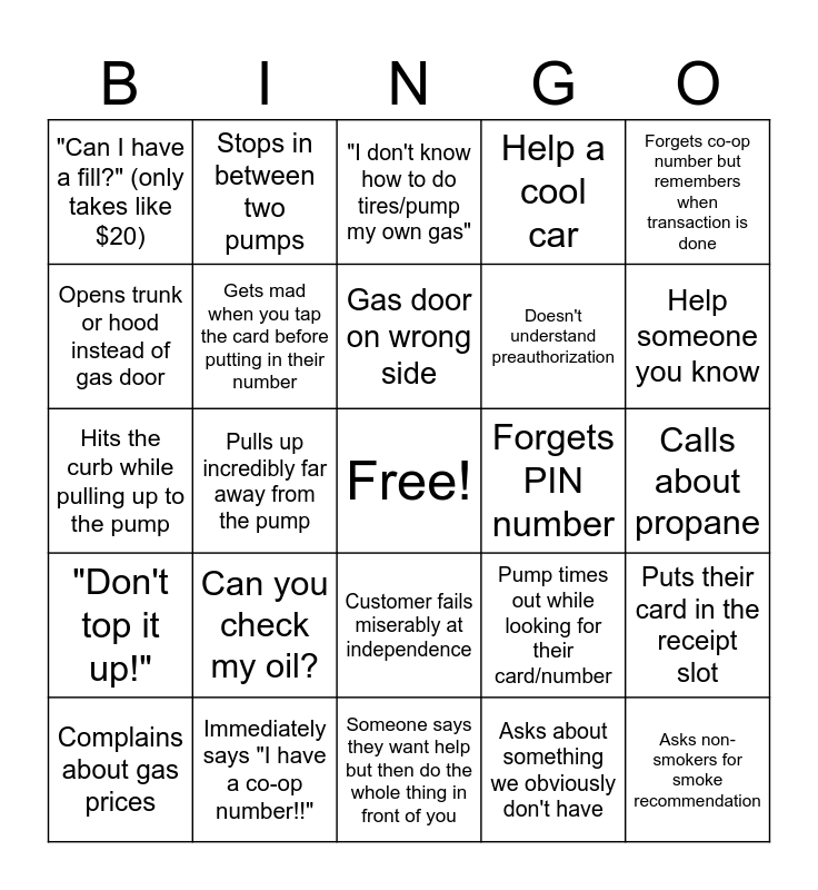 This bingo card has a free space and 24 words: Can you check my oil?, Immediately says "I have a co-op number!!", Gas door on wrong side, Complains about gas prices, Forgets co-op number but remembers when transaction is done, "Can I have a fill?" (only takes like $20), Opens trunk or hood instead of gas door, Stops in between two pumps, Forgets PIN number, Customer fails miserably at independence, Doesn't understand preauthorization, Hits the curb while pulling up to the pump, Pump times out while looking for their card/number, Puts their card in the receipt slot, Gets mad when you tap the card before putting in their number, Asks about something we obviously don't have, Calls about propane, "I don't know how to do tires/pump my own gas", Help someone you know, Pulls up incredibly far away from the pump, Asks non-smokers for smoke recommendation, "Don't top it up!", Help a cool car and Someone says they want help but then do the whole thing in front of you.