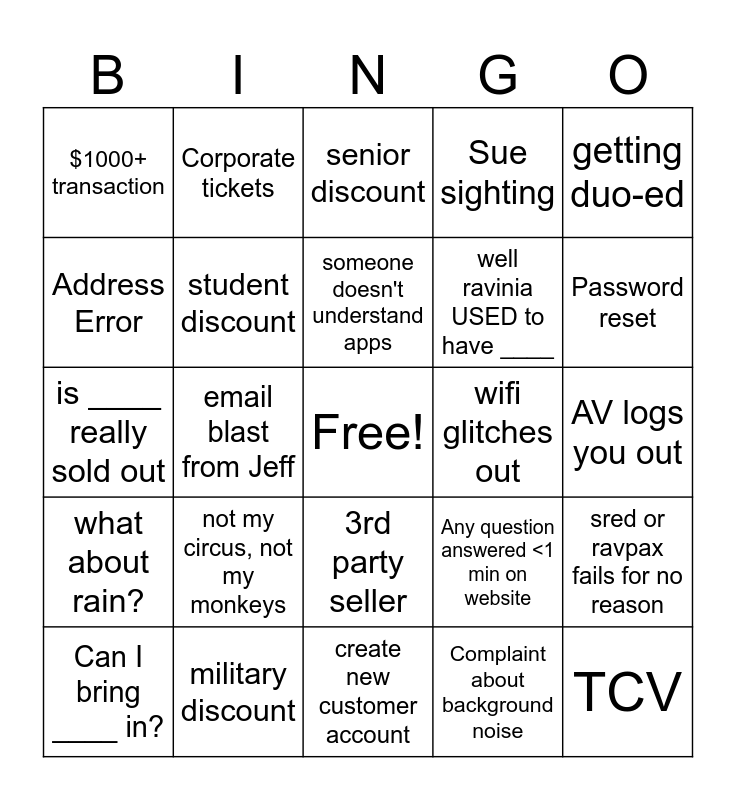This bingo card has a free space and 41 words: outdated gift cert, is ____ really sold out, complaint about app, student discount, military discount, 3rd party seller, someone doesn't understand apps, community tickets, getting duo-ed, what about rain?, email blast from Jeff, Sue sighting, TCV, AV logs you out, wifi glitches out, not my circus, not my monkeys, lost and found, $1000+ transaction, computer updates, senior discount, sred or ravpax fails for no reason, ticket donation, create new customer account, well ravinia USED to have ____, calendar sent out, Shark!, Complaint about background noise, 20+ min call, Password reset, Opus+ donor call, Is the box office open in person?, Corporate tickets, Can I bring ____ in?, When does parking/gates open?, Any question answered <1 min on website, Address Error, Transferring tickets, Restaurant reservation question, Exchange, transfer to development and complaint about processing fee.