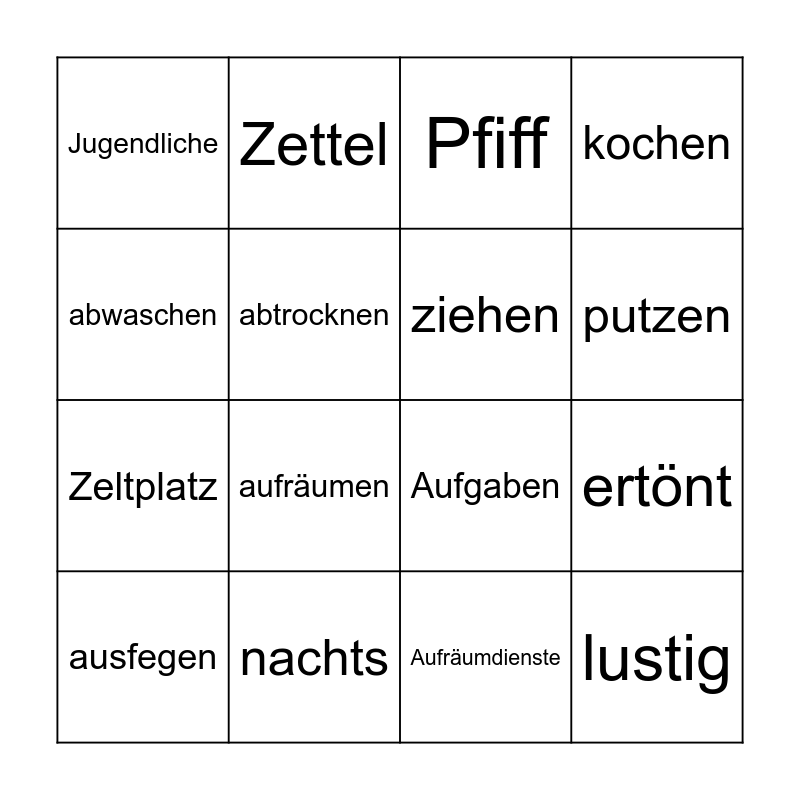 This bingo card has 16 words: nachts, ertönt, Pfiff, Jugendliche, Zeltplatz, Zettel, Aufgaben, Aufräumdienste, abwaschen, abtrocknen, ausfegen, kochen, aufräumen, putzen, ziehen and lustig.