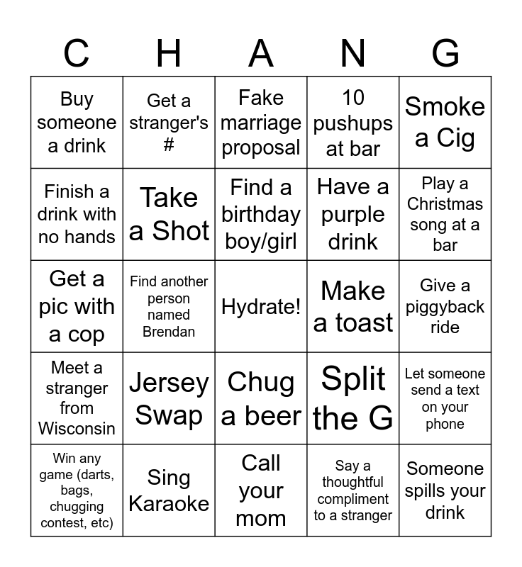 This bingo card has a free space and 24 words: Jersey Swap, Sing Karaoke, Find a birthday boy/girl, Win any game (darts, bags, chugging contest, etc), Smoke a Cig, Buy someone a drink, Finish a drink with no hands, Get a stranger's #, Make a toast, Chug a beer, Have a purple drink, Get a pic with a cop, Split the G, Let someone send a text on your phone, Take a Shot, Say a thoughtful compliment to a stranger, Give a piggyback ride, Fake marriage proposal, Play a Christmas song at a bar, Find another person named Brendan, Someone spills your drink, Meet a stranger from Wisconsin, 10 pushups at bar and Call your mom.