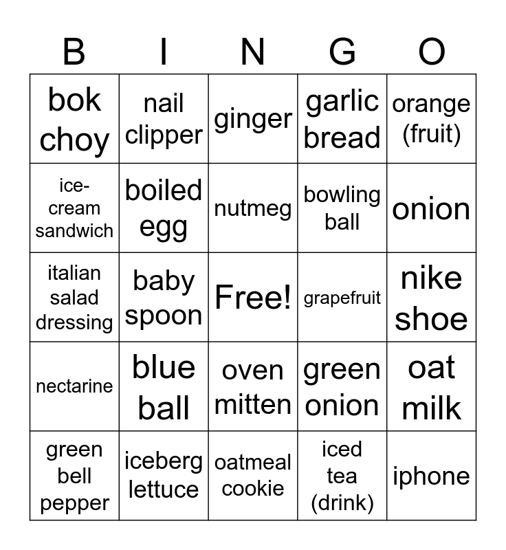 This bingo card has a free space and 24 words: blue ball, iceberg lettuce, nutmeg, green bell pepper, orange (fruit), bok choy, ice-cream sandwich, nail clipper, grapefruit, oven mitten, bowling ball, italian salad dressing, green onion, oat milk, boiled egg, iced tea (drink), nike shoe, ginger, onion, baby spoon, iphone, nectarine, garlic bread and oatmeal cookie.