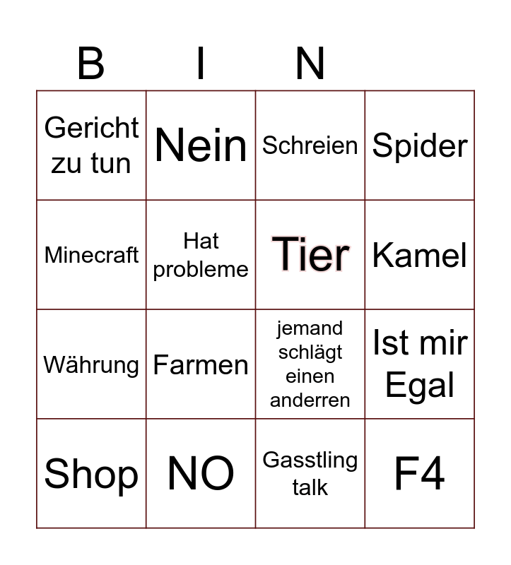 This bingo card has 16 words: NO, Ist mir Egal, Schreien, Gericht zu tun, Währung, Nein, jemand schlägt einen anderren, Gasstling talk, Minecraft, Hat probleme, Shop, Spider, Farmen, Kamel, Tier and F4.