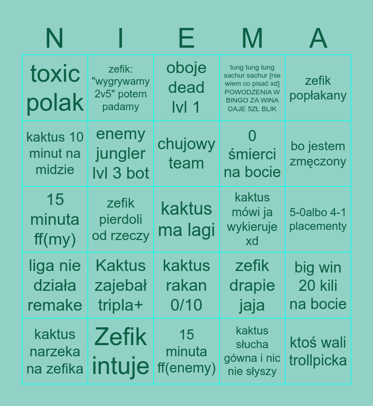 This bingo card has a free space and 24 words: Kaktus zajebał tripla+, Zefik intuje, chujowy team, kaktus narzeka na zefika, zefik popłakany, toxic polak, kaktus 10 minut na midzie, zefik: "wygrywamy 2v5" potem padamy, kaktus mówi ja wykieruje xd, kaktus rakan 0/10, 0 śmierci na bocie, 15 minuta ff(my), zefik drapie jaja, big win 20 kili na bocie, enemy jungler lvl 3 bot, kaktus słucha gówna i nic nie słyszy, 5-0albo 4-1 placementy, oboje dead lvl 1, bo jestem zmęczony, zefik pierdoli od rzeczy, ktoś wali trollpicka, liga nie działa remake, tung tung tung sachur sachur [nie wiem co pisać xd] POWODZENIA W BINGO ZA WINA DAJE 5ZŁ BLIK and 15 minuta ff(enemy).