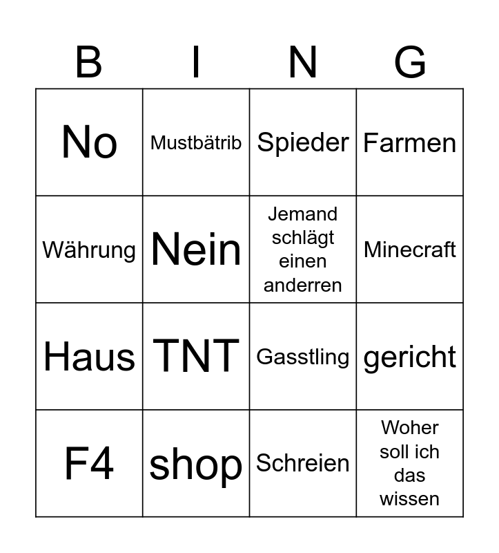 This bingo card has 16 words: F4, shop, Spieder, Farmen, Währung, Mustbätrib, Gasstling, gericht, No, Nein, Schreien, Minecraft, Haus, TNT, Jemand schlägt einen anderren and Woher soll ich das wissen.