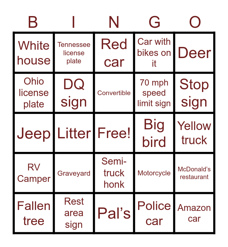 This bingo card has a free space and 24 words: Graveyard, Rest area sign, Convertible, Fallen tree, Deer, White house, Ohio license plate, Tennessee license plate, Big bird, Semi-truck honk, 70 mph speed limit sign, Jeep, Motorcycle, McDonald’s restaurant, DQ sign, Police car, Yellow truck, Red car, Stop sign, Litter, Amazon car, RV Camper, Car with bikes on it and Pal’s.