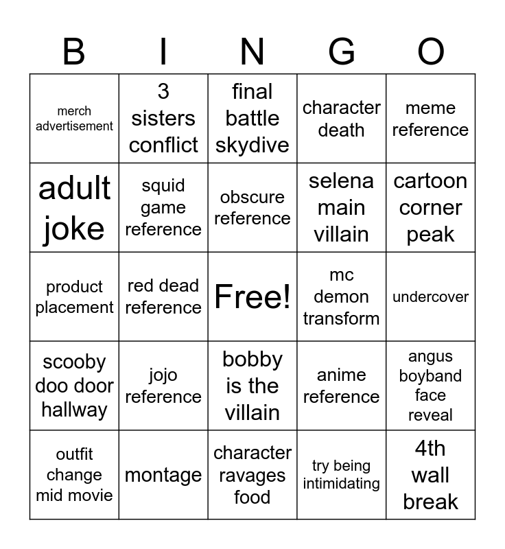 This bingo card has a free space and 24 words: jojo reference, montage, obscure reference, outfit change mid movie, meme reference, merch advertisement, adult joke, 3 sisters conflict, mc demon transform, bobby is the villain, selena main villain, product placement, anime reference, angus boyband face reveal, squid game reference, try being intimidating, undercover, final battle skydive, cartoon corner peak, red dead reference, 4th wall break, scooby doo door hallway, character death and character ravages food.