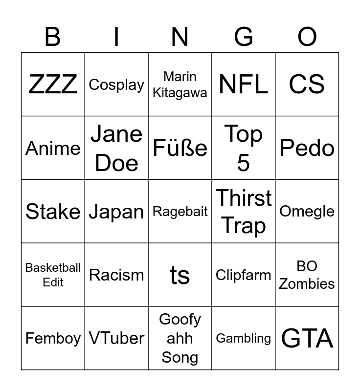 This bingo card has a free space and 24 words: Racism, VTuber, Füße, Femboy, CS, ZZZ, Anime, Cosplay, Thirst Trap, ts, Top 5, Stake, Clipfarm, BO Zombies, Jane Doe, Gambling, Omegle, Marin Kitagawa, Pedo, Japan, GTA, Basketball Edit, NFL and Goofy ahh Song.