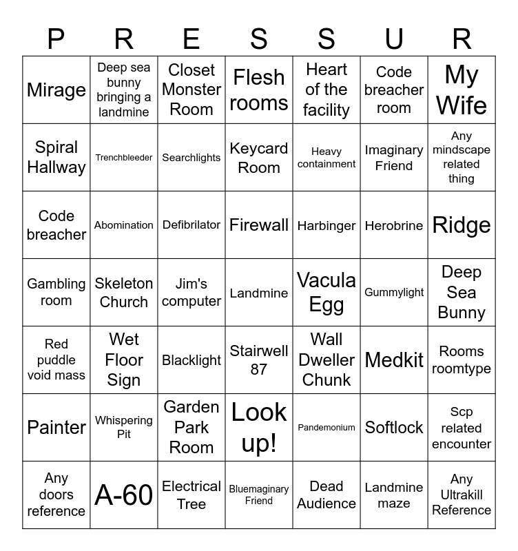 This bingo card has a free space and 48 words: Pandemonium, Imaginary Friend, Bluemaginary Friend, Skeleton Church, Defibrilator, Deep Sea Bunny, Deep sea bunny bringing a landmine, A-60, Code breacher room, Stairwell 87, My Wife, Flesh rooms, Herobrine, Harbinger, Painter, Gummylight, Spiral Hallway, Any mindscape related thing, Softlock, Heart of the facility, Heavy containment, Jim's computer, Mirage, Trenchbleeder, Scp related encounter, Searchlights, Ridge, Any doors reference, Firewall, Abomination, Landmine maze, Vacula Egg, Rooms roomtype, Whispering Pit, Gambling room, Wall Dweller Chunk, Medkit, Code breacher, Blacklight, Garden Park Room, Red puddle void mass, Any Ultrakill Reference, Closet Monster Room, Electrical Tree, Keycard Room, Look up!, Wet Floor Sign and Dead Audience.
