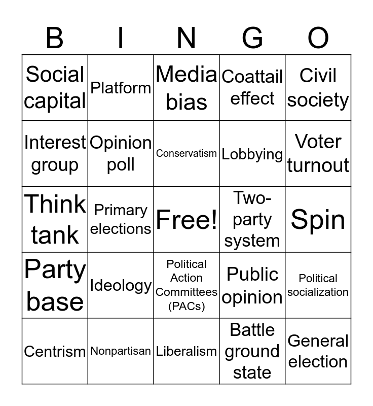 This bingo card has a free space and 25 words: Ideology, Liberalism, Conservatism, Centrism, Civil society, Social capital, Interest group, Platform, Two-party system, Political Action Committees (PACs), Lobbying, Think tank, Public opinion, Political socialization, Opinion poll, Mass media, Spin, Media bias, Voter turnout, Primary elections, General election, Nonpartisan, Party base, Coattail effect and Battle ground state.