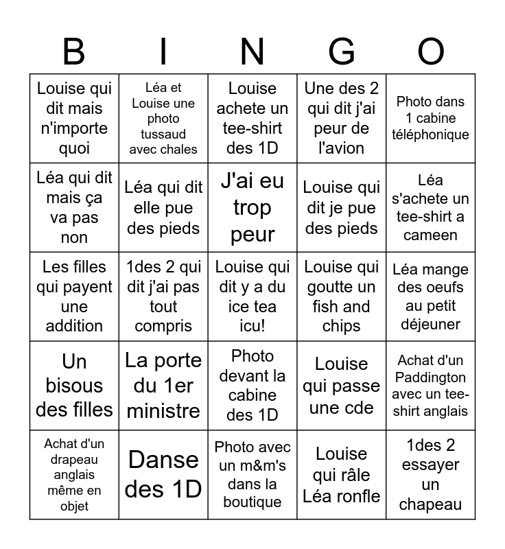 This bingo card has a free space and 24 words: La porte du 1er ministre, Danse des 1D, J'ai eu trop peur, Achat d'un drapeau anglais même en objet, Photo dans 1 cabine téléphonique, Louise qui dit mais n'importe quoi, Léa qui dit mais ça va pas non, Léa et Louise une photo tussaud avec chales, Louise qui goutte un fish and chips, Photo devant la cabine des 1D, Louise qui dit je pue des pieds, Les filles qui payent une addition, Louise qui passe une cde, Achat d'un Paddington avec un tee-shirt anglais, Léa qui dit elle pue des pieds, Louise qui râle Léa ronfle, Léa mange des oeufs au petit déjeuner, Louise achete un tee-shirt des 1D, Léa s'achete un tee-shirt a cameen, 1des 2 qui dit j'ai pas tout compris, 1des 2 essayer un chapeau, Un bisous des filles, Une des 2 qui dit j'ai peur de l'avion and Photo avec un m&m's dans la boutique.