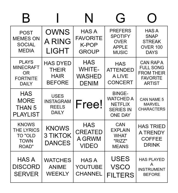 This bingo card has a free space and 24 words: HAS A DISCORD SERVER, KNOWS 3 TIKTOK DANCES, HAS WHITE-WASHED DENIM, USES VSCO FILTERS, HAS A SNAP STREAK OVER 100 DAYS, POST MEMES ON SOCIAL MEDIA, OWNS A RING LIGHT, HAS A FAVORITE K-POP GROUP, BINGE-WATCHED A NETFLIX SERIES IN ONE DAY, CAN NAME 5 MARVEL CHARACTERS, HAS MORE THAN 5 PLAYLIST, HAS DYED THEIR HAIR BEFORE, CAN EXPLAIN WHAT "RIZZ" MEANS, HAS TRIED A TRENDY COFFEE DRINK, PLAYS MINECRAFT OR FORTNITE DAILY, WATCHES ANIME WEEKLY, HAS A YOUTUBE CHANNEL, PREFERS SPOTIFY OVER APPLE MUSIC, CAN RAP A FULL SONG FROM THEIR FAVORITE ARTIST, KNOWS THE LYRICS TO "OLD TOWN ROAD", USES INSTAGRAM REELS DAILY, HAS CREATED A GRWM VIDEO, HAS ATTENDED A LIVE CONCERT and HAS PLAYED A INSTRUMENT BEFORE.