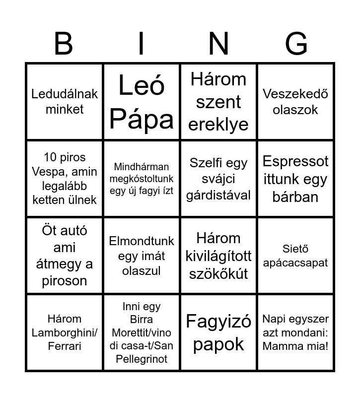 This bingo card has 16 words: Inni egy Birra Morettit/vino di casa-t/San Pellegrinot, Siető apácacsapat, Három szent ereklye, Ledudálnak minket, Öt autó ami átmegy a piroson, Leó Pápa, Három kivilágított szökőkút, Fagyizó papok, 10 piros Vespa, amin legalább ketten ülnek, Mindhárman megkóstoltunk egy új fagyi ízt, Három Lamborghini/ Ferrari, Veszekedő olaszok, Elmondtunk egy imát olaszul, Espressot ittunk egy bárban, Szelfi egy svájci gárdistával and Napi egyszer azt mondani: Mamma mia!.