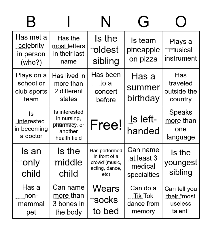 This bingo card has 23 images, a free space and 24 words: Is the middle child, Can name more than 3 bones in the body, Has been to a concert before, Has a non-mammal pet, Plays a musical instrument, Has met a celebrity in person (who?), Plays on a school or club sports team, Has the most letters in their last name, Is left-handed, Has performed in front of a crowd (music, acting, dance, etc), Has a summer birthday, Is interested in becoming a doctor, Can name at least 3 medical specialties, Is the youngest sibling, Has lived in more than 2 different states, Can do a Tik Tok dance from memory, Speaks more than one language, Is the oldest sibling, Has traveled outside the country, Is interested in nursing, pharmacy, or another health field, Can tell you their “most useless talent”, Is an only child, Is team pineapple on pizza and Wears socks to bed.