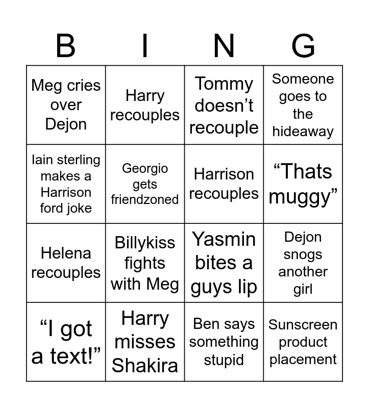 This bingo card has 16 words: Harry misses Shakira, Dejon snogs another girl, Tommy doesn’t recouple, Meg cries over Dejon, Helena recouples, Harry recouples, Yasmin bites a guys lip, Ben says something stupid, Iain sterling makes a Harrison ford joke, Georgio gets friendzoned, “I got a text!”, Someone goes to the hideaway, Billykiss fights with Meg, “Thats muggy”, Harrison recouples and Sunscreen product placement.