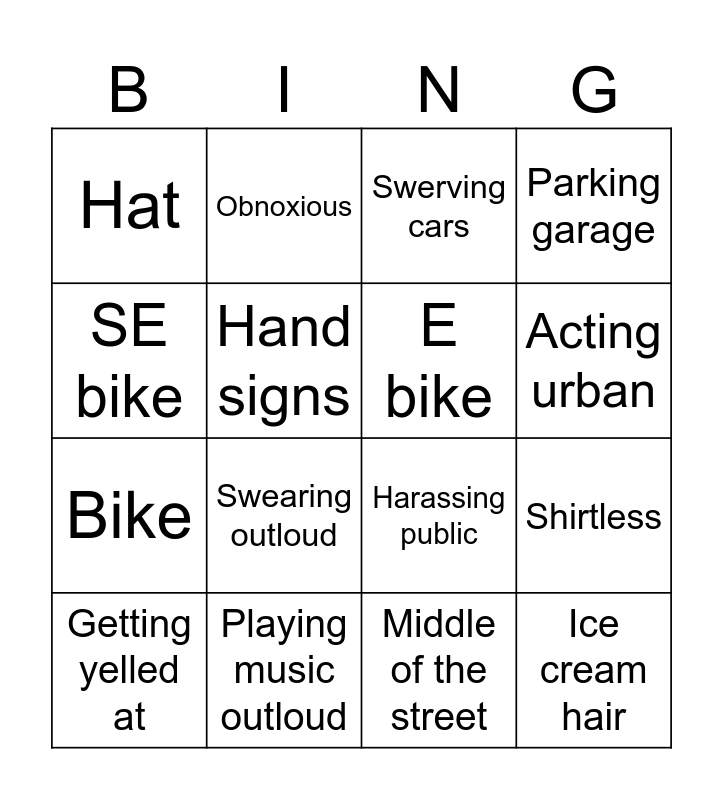 This bingo card has 20 words: Shirtless, Wheelie, Swerving cars, Being a asshole, Getting yelled at, SE bike, Playing music outloud, Hat, Bike, Obnoxious, Swearing outloud, Harassing public, Hand signs, Ice cream hair, E bike, Scooter, Acting urban, Parking garage, Middle of the street and Yelling Random lyrics.