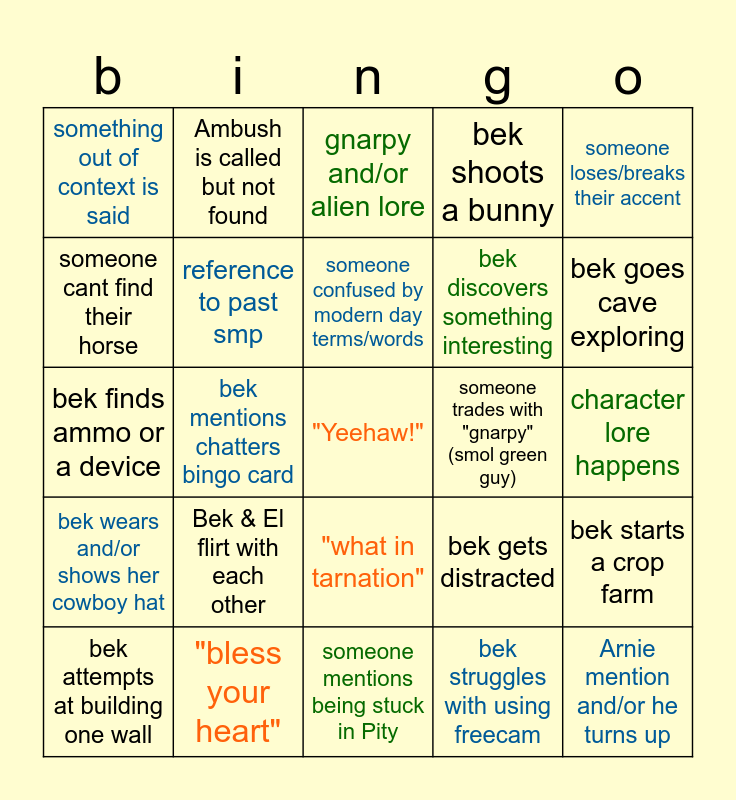 This bingo card has a free space and 24 words: Bek & El flirt with each other, "bless your heart", someone confused by modern day terms/words, bek attempts at building one wall, someone loses/breaks their accent, something out of context is said, someone cant find their horse, Ambush is called but not found, someone trades with "gnarpy" (smol green guy), "what in tarnation", bek discovers something interesting, bek finds ammo or a device, bek gets distracted, bek starts a crop farm, reference to past smp, bek struggles with using freecam, character lore happens, gnarpy and/or alien lore, bek goes cave exploring, bek mentions chatters bingo card, Arnie mention and/or he turns up, bek wears and/or shows her cowboy hat, bek shoots a bunny and someone mentions being stuck in Pity.