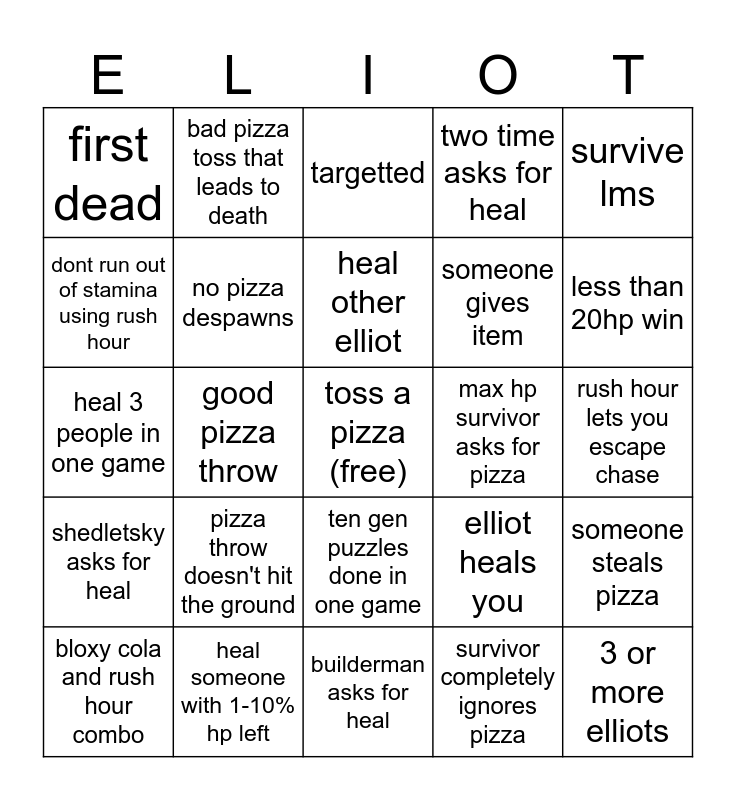 This bingo card has a free space and 24 words: pizza throw doesn't hit the ground, heal someone with 1-10% hp left, heal other elliot, bloxy cola and rush hour combo, survive lms, first dead, dont run out of stamina using rush hour, bad pizza toss that leads to death, max hp survivor asks for pizza, ten gen puzzles done in one game, someone gives item, heal 3 people in one game, elliot heals you, someone steals pizza, no pizza despawns, survivor completely ignores pizza, rush hour lets you escape chase, targetted, less than 20hp win, good pizza throw, 3 or more elliots, shedletsky asks for heal, two time asks for heal and builderman asks for heal.