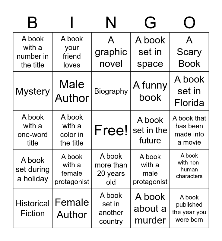 This bingo card has a free space and 24 words: A book with a female protagonist, Female Author, Biography, Historical Fiction, A Scary Book, A book with a number in the title, Mystery, A book your friend loves, A book set in the future, A book more than 20 years old, A funny book, A book with a one-word title, A book with a male protagonist, A book with non-human characters, Male Author, A book about a murder, A book that has been made into a movie, A graphic novel, A book set in Florida, A book with a color in the title, A book published the year you were born, A book set during a holiday, A book set in space and A book set in another country.