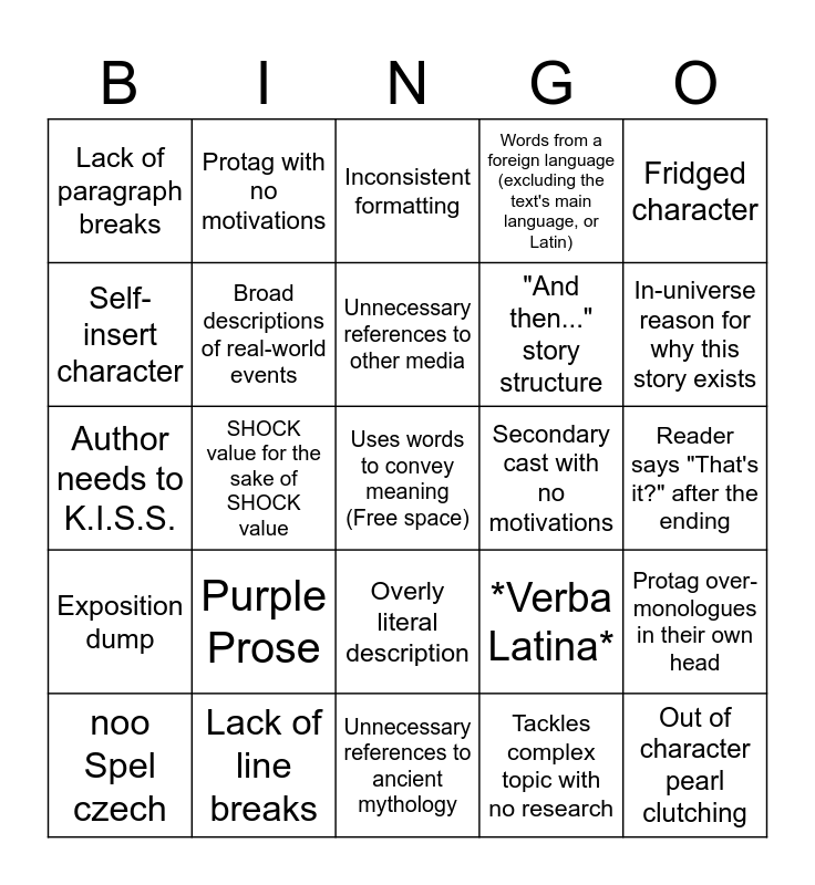 This bingo card has a free space and 24 words: Purple Prose, Lack of line breaks, Unnecessary references to other media, noo Spel czech, Fridged character, Lack of paragraph breaks, Self-insert character, Protag with no motivations, Secondary cast with no motivations, Overly literal description, "And then..." story structure, Author needs to K.I.S.S., *Verba Latina*, Protag over-monologues in their own head, Broad descriptions of real-world events, Tackles complex topic with no research, Reader says "That's it?" after the ending, Inconsistent formatting, In-universe reason for why this story exists, SHOCK value for the sake of SHOCK value, Out of character pearl clutching, Exposition dump, Words from a foreign language (excluding the text's main language, or Latin) and Unnecessary references to ancient mythology.