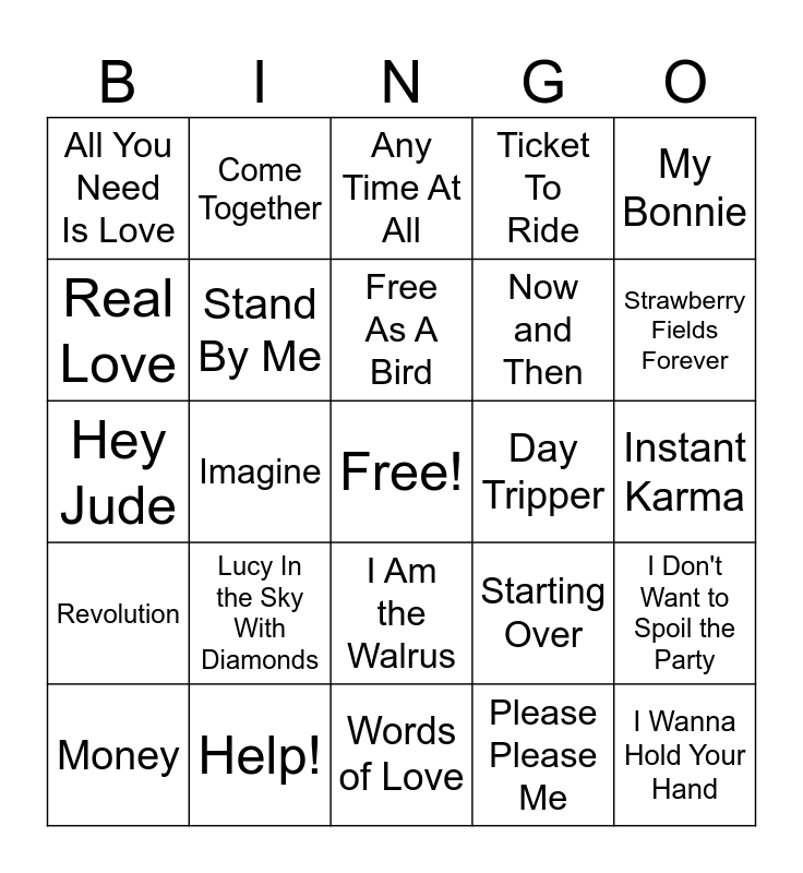 This bingo card has a free space and 43 words: I Feel Fine, I Wanna Hold Your Hand, Twist and Shout, Money, A Hard Day's Night, Please Please Me, Any Time At All, You Can't Do That, My Bonnie, Help!, Ticket To Ride, Day Tripper, I Am the Walrus, Lucy In the Sky With Diamonds, Baby's In Black, Words of Love, Rock and Roll Music, Hey Jude, Dear Prudence, Strawberry Fields Forever, Come Together, Hey Bulldog, Nowhere Man, All You Need Is Love, Norwegian Wood, Instant Karma, Whatever Gets You Through the Night, Woman, Starting Over, Revolution, Don't Let Me Down, I Don't Want to Spoil the Party, Give Peace a Chance, Imagine, You're Gonna Lose that Girl, Girl, In My Life, Free As A Bird, Real Love, Now and Then, You've Got to Hide Your Love Away, Stand By Me and I'm So Tired.