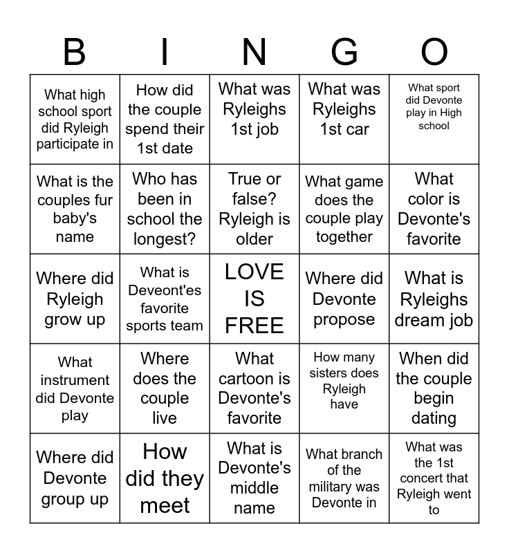 This bingo card has a free space and 24 words: Where does the couple live, How did they meet, True or false? Ryleigh is older, Where did Devonte group up, What sport did Devonte play in High school, What high school sport did Ryleigh participate in, What is the couples fur baby's name, How did the couple spend their 1st date, Where did Devonte propose, What cartoon is Devonte's favorite, What game does the couple play together, Where did Ryleigh grow up, How many sisters does Ryleigh have, When did the couple begin dating, Who has been in school the longest?, What branch of the military was Devonte in, What is Ryleighs dream job, What was Ryleighs 1st job, What color is Devonte's favorite, What is Deveont'es favorite sports team, What was the 1st concert that Ryleigh went to, What instrument did Devonte play, What was Ryleighs 1st car and What is Devonte's middle name.