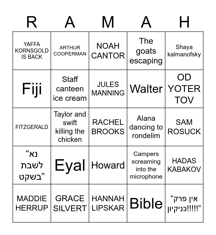 This bingo card has 36 words: When your laundry gets lost, Grilled cheese and French fries lunch, Bishul dinner, Staff canteen ice cream, Campers screaming into the microphone, “נא לשבת בשקט”, JULES MANNING, Gesher initiation, Shaya kalmanofsky, Chef scott, Taylor and swift killing the chicken, The goats escaping, “אני רוצה בבקשה”, Alana dancing to rondelim, OD YOTER TOV, YAFFA KORNSGOLD IS BACK, “אין פרק כניקיון!!!!!”, Eyal, RACHEL BROOKS, NOAH CANTOR, SAM ROSUCK, HADAS KABAKOV, GRACE SILVERT, MADDIE HERRUP, HANNAH LIPSKAR, ARTHUR COOPERMAN, FITZGERALD, Beef, Walter, Fiji, Glitters, Rashbam, Bible, Howard, Shaya fest and Friday night shira.