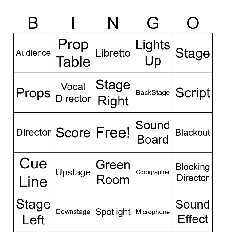 This bingo card has a free space and 24 words: Upstage, Downstage, Stage Right, Stage Left, Stage, Audience, Props, Prop Table, Sound Board, Green Room, BackStage, Director, Corographer, Blocking Director, Vocal Director, Microphone, Blackout, Libretto, Script, Score, Sound Effect, Cue Line, Lights Up and Spotlight.
