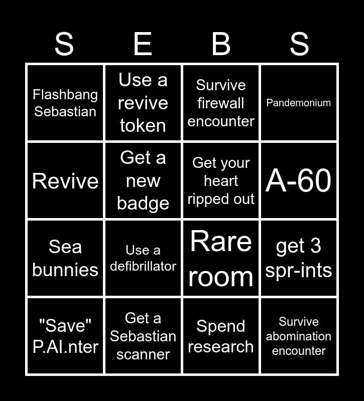 This bingo card has 16 words: "Save" P.AI.nter, Get a Sebastian scanner, Survive firewall encounter, Pandemonium, Revive, Use a revive token, Rare room, get 3 spr-ints, Flashbang Sebastian, Get a new badge, Spend research, A-60, Sea bunnies, Use a defibrillator, Get your heart ripped out and Survive abomination encounter.