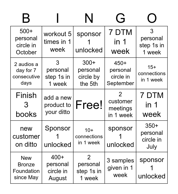 This bingo card has a free space and 24 words: New Bronze Foundation since May, Sponsor 1 unlocked, 300+ personal circle by the 5th, 3 samples given in 1 week, 3 personal step 1s in 1 week, 500+ personal circle in October, workout 5 times in 1 week, sponsor 1 unlocked, 2 customer meetings in 1 week, 7 DTM in 1 week, Finish 3 books, 3 personal step 1s in 1 week, sponsor 1 unlocked, 350+ personal circle in July, 2 audios a day for 7 consecutive days, 400+ personal circle in August, 2 personal step 1s in 1 week, 7 DTM in 1 week, 15+ connections in 1 week, new customer on ditto, add a new product to your ditto, 10+ connections in 1 week, 450+ personal circle in September and sponsor 1 unlocked.