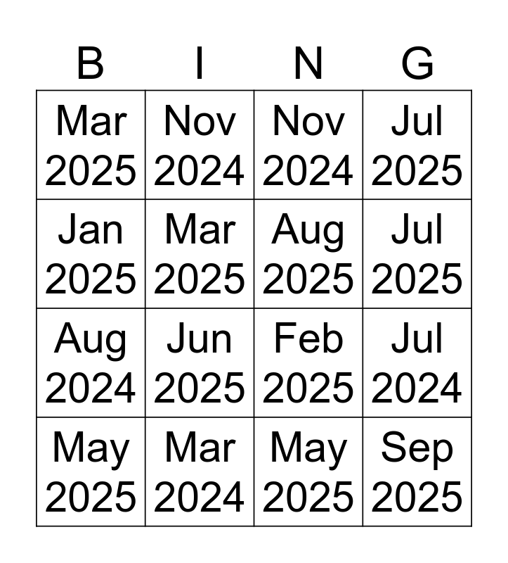 This bingo card has 16 words: Mar 2024, Jul 2024, Nov 2024, Mar 2025, Aug 2024, Nov 2024, Feb 2025, May 2025, Jan 2025, Mar 2025, May 2025, Jul 2025, Jun 2025, Jul 2025, Aug 2025 and Sep 2025.