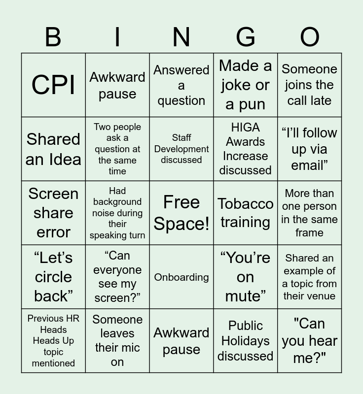 This bingo card has a free space and 24 words: “Can everyone see my screen?”, Someone leaves their mic on, Staff Development discussed, Previous HR Heads Heads Up topic mentioned, Someone joins the call late, CPI, Shared an Idea, Awkward pause, Tobacco training, Onboarding, HIGA Awards Increase discussed, Screen share error, “You’re on mute”, Shared an example of a topic from their venue, Two people ask a question at the same time, Public Holidays discussed, More than one person in the same frame, Answered a question, “I’ll follow up via email”, Had background noise during their speaking turn, "Can you hear me?", “Let’s circle back”, Made a joke or a pun and Awkward pause.